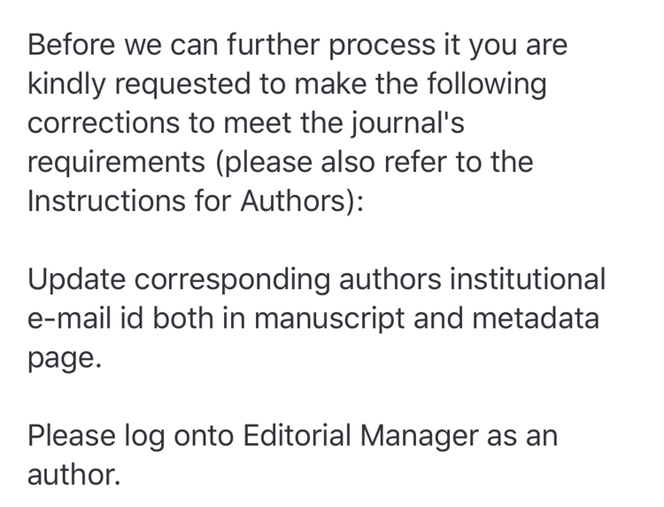 投稿apoptosis这个期刊,一直被sent back to author,编辑要求Update corresponding authors institutional e-mail id both in manuscript and metadata page.但是我上一版已经把手稿里和网站上所有作者的邮箱都改成institutional 邮箱了,还是被返回,请问大家有相同的遭遇吗?