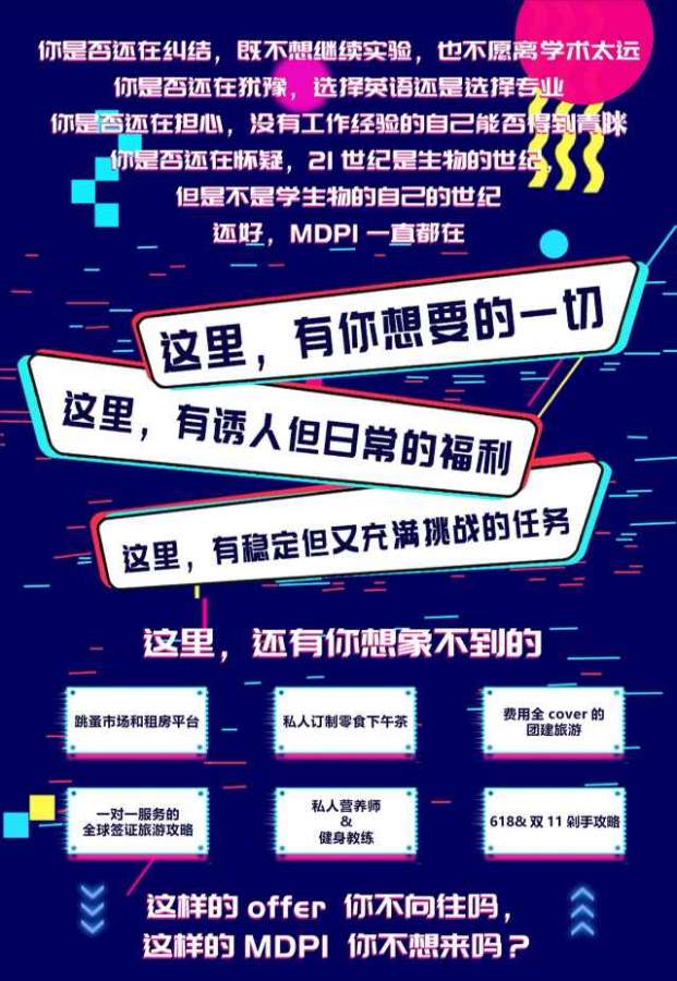 瑞士MDPI出版社( 国际期刊200多个)现招聘应、往届毕业生担任全职SCI、EI英语期刊助理编辑。您,您的同学或朋友即将毕业或正在找工作,并对编辑工作感兴趣的话,欢迎您推荐他们加入我们的编辑团队。 工作地点:北京,天津,武汉 招聘要求:硕士以上学历,理工科背景,英语六级 待遇:月基本工资9000-13000 + 丰厚的绩效奖金。 有意向的同学,欢迎将简历发送至joy.wang@mdpi.com,内部推荐,优先面试。 发自小木虫Android客户端 |