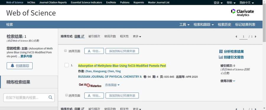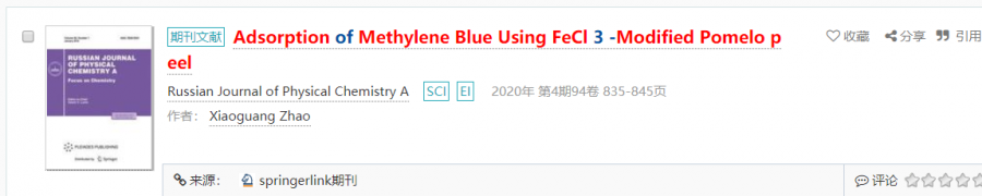 您好十分感谢!!能不能再麻烦您帮忙查一下sci库是否收录了Adsorption of Methylene Blue Using FeCl3-Modified Pomelo peel,就是这本期刊的,如果能查到收录日期就再好不过了,十分感谢您!! ![]() 发自小木虫Android客户端 |
