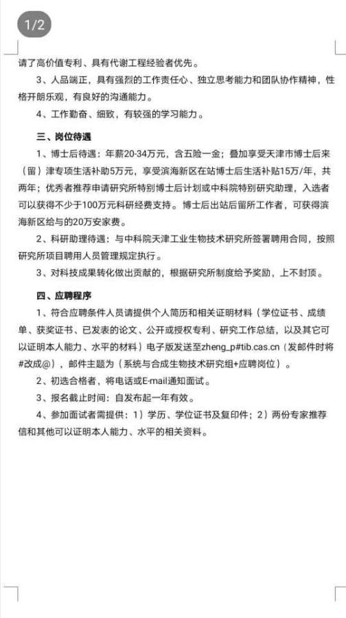 中科院天津工业生物技术研究所招聘启事
