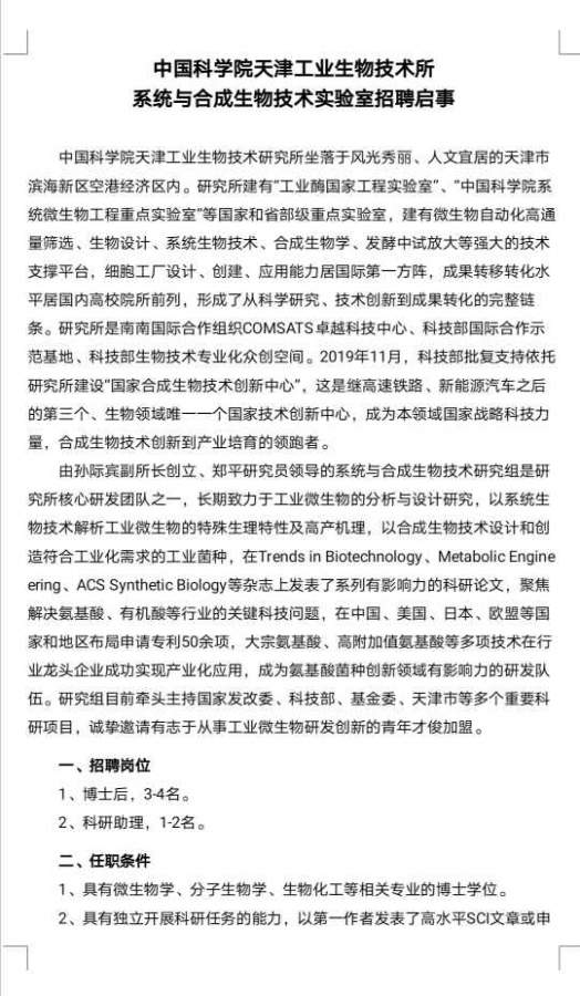 中科院天津工业生物技术研究所系统与合成生物技术实验室招聘启事