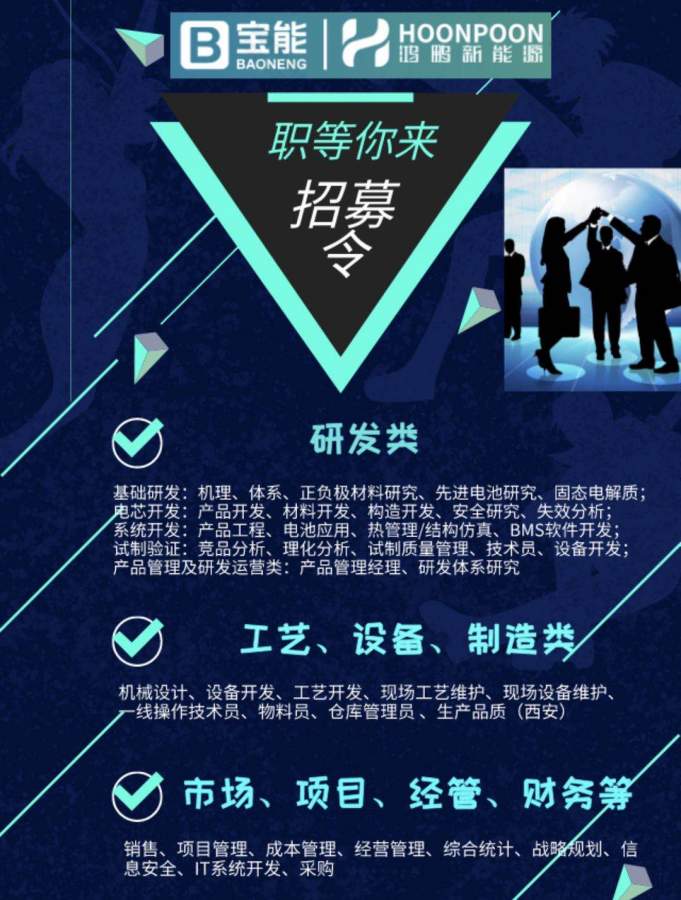 工作职责 岗位职责: 1、积极跟踪国内外动力电池新类型、新技术的发展趋势与动态,及时向公司提供新产品与新技术研发计划与意向; 2、负责组织或参与公司重大科研项目的研发; 3、参与制定研究院先进电池项目的技术方案、实施计划的制定、阶段性工作评审和项目验收工作; 4、研究解决或者指导协助解决先进电池研究项目实施过程中出现的各种问题; 5、完成项目节点分析报告,提出相应的优化建议;负责本部门团队建设及人员培养,为下属提供持续的指导、支持和反馈;其他临时事项; 工作要求 任职资格: 1、硕士及以上学历,电化学、化学、材料学等专业,英文:cet6以上; 2、对锂离子电池有较深的理解,能对未来锂离子电池在高能量密度、高安全性、高倍率型的发展方向有深入见解; 3、深刻理解电池材料特性,对锂电池、锂金属电池、固态电池的正负极材料以及电解液(质)的构成、性能有深入理解,良好的分析与沟通能力 4、有较强的创新能力、具备独立发现、解决问题和提供决策支持的能力。 5、抗压能力强,具备独立发现、解决问题和提供决策支持的能力。 公司待遇丰厚,拥有完成的理化分析实验室(包括,in-situ xrd, in-situ raman,sem-fib,icp-ms等先进表征设备),材料合成实验室,试验线,中试线,产线等,请积极联系。 [ last edited by wherelb on 2020-5-15 at 21:18 ] WeChat Image_20200518154206.jpg [ Last edited by wherelb on 2020-5-18 at 15:48 ] [ 来自版块群 江苏 ] |