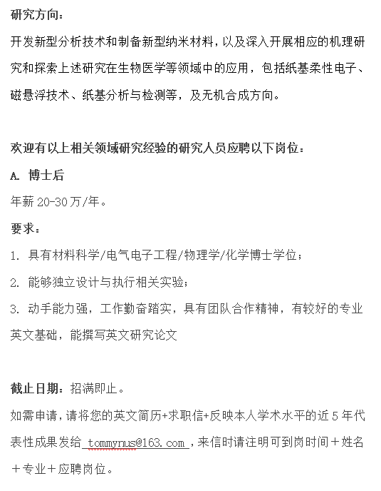 西北工业大学于海东课题组2020诚招博士后 课题组简介: 于海东于2018年4月,加入西北工业大学柔性电子研究院,担任教授至今。 工作经历 Work Experience 2018年4月 – 至今 ?教授 ?西北工业大学柔性电子研究院; 2015年11月 – 至今 ?教授 ?南京工业大学先进材料研究院; 2012年9月 – 2014年6月 ?博士后 ?美国哈佛大学化学系Whitesides研究组; 2009年4月 –2015年11月 ?研究员 ?新加坡科技研究局材料研究所。 教育经历 Education Experience 2005年1月 – 2009年1月 ?博士 ?新加坡国立大学 生物工程系; 2003年1月 – 2005年1月 ?硕士 ?新加坡国立大学 材料科学系; 1998年9月 – 2002年7月 ?本科 ?北京大学 化学与分子工程学院。 个人主页: https://teacher.nwpu.edu.cn/yuhaidong.html ? 研究方向: 开发新型分析技术和制备新型纳米材料,以及深入开展相应的机理研究和探索上述研究在生物医学等领域中的应用,包括纸基柔性电子、磁悬浮技术、纸基分析与检测等,及无机合成方向。 ? 欢迎有以上相关领域研究经验的研究人员应聘以下岗位: A. 博士后 年薪20-30万/年。 要求: 1. 具有材料科学/电气电子工程/物理学/化学博士学位; 2. 能够独立设计与执行相关实验; 3. 动手能力强,工作勤奋踏实,具有团队合作精神,有较好的专业英文基础,能撰写英文研究论文 ? 截止日期:招满即止。 如需申请,请将您的英文简历+求职信+反映本人学术水平的近5年代表性成果发给?tommynus@163.com?,来信时请注明可到岗时间+姓名+专业+应聘岗位。 ? 发自小木虫IOS客户端 |