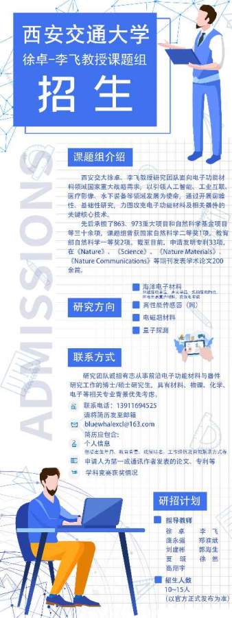 西安交通大学电信学部电子科学与技术专业电子功能材料方向招收调剂考生。团队曾在过去一年中发表Science、Nature主刊论文各一篇。 招生要求:一志愿报考西安交通大学材料、化工、电气、能动学院,符合西安交通大学复试分数线,并且对电子功能材料(电解质物理、晶体物理)一定了解和基础的学生,欢迎联系。请将自己简历,发送至邮箱:bluewhalexcl@163.com,邮件名字为姓名_本科院校_报考西交的专业_分数 仅接受校内调剂,感谢。 发自小木虫Android客户端 |