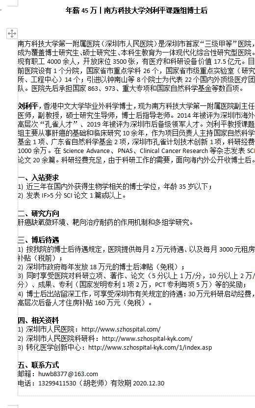 南方科技大学第一附属医院(深圳市人民医院)是深圳市首家“三级甲等”医院,成为覆盖博士研究生、硕士研究生、本科生教育为一体现代化综合性研究型医院。现有职工4000余人,开放床位3500张,有医疗和科研设备价值17.5亿元。目前医院设有1个分院,国家省市重点学科26个,国家省市级重点实验室(研究所、工程中心)14个;引进以钟南山等8个院士为代表22个国内外顶级医疗团队。医院先后承担国家863、973、重大专项和国家自然科学基金等数百项。刘利平,香港中文大学毕业外科学博士,现为南方科技大学第一附属医院副主任医师,副教授,硕士研究生导师,博士后指导老师。2014年被评为深圳市海外高层次“孔雀人才”、2019年被评为深圳市后备级领军人才。刘利平教授课题组主要从事肝癌的基础和临床研究10余年,作为项目负责人主持国家自然科学基金1项、广东省自然科学基金2项,深圳市孔雀计划技术创新1项,科研经费1000余万。在ScienceAdvance、PNAS、ClinicalCancerResearch等杂志发表SCI论文20余篇。科研经费充足,由于科研工作的需要,面向海内外公开招聘博士后。一、入站要求1)近三年在国内外获得生物学相关的博士学位,年龄35岁以下;2)发表IF>5分SCI论文1篇或以上。 发自小木虫Android客户端 |