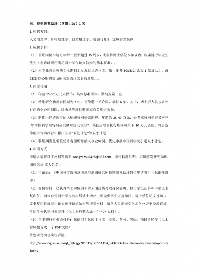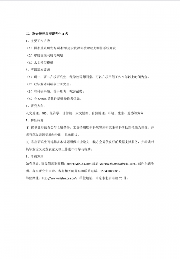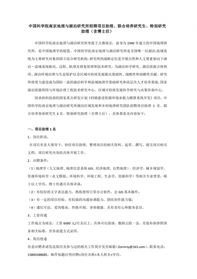 因承担科技部的国家重点研发计划《村镇建设资源环境承载力测算系统开发》项目,中国科学院南京地理与湖泊研究所湖泊区域发展和乡村地理研究团队招聘项目助理1名、联合培养客座研究生3名、特别研究助理(含博士后),具体要求及内容见图片详情 发自小木虫IOS客户端 |