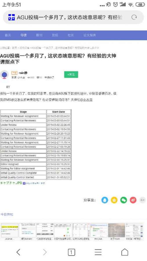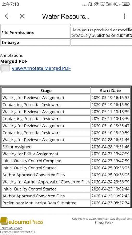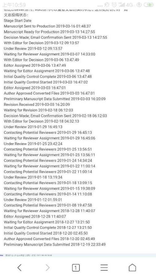 本人小白,第一次写投sci,自第一次投稿编辑让修改语言再投后,二次提交到现在过了一个月多了(38天),看current stage的话,编辑期间应该是三次联系了审稿人,但奈何审稿人都不愿意审,并且每次联系的时间间隔越来越长(上一次到今天14天没有再找了),我看别人都说agu的期刊效率很高,网上扒了其他前辈们在前些年的投稿状态截图,发现人家在联系审稿人的时候都是几天或者一天就联系好几次,唉,真的是羡慕而又无可奈何呀……所以想发个帖求助下,看看是稿件数量问题(4.13-4.23,稿件编号增加了70+,据此推测全年2500+投稿量?那么录用率就差不多是25%?),大家今年都这样,还是我这个比较特殊?(编辑不太喜欢还是怎么滴),最后,前四张是小木虫上扒出的前几年前辈们的,最后一张图是我自己的……唉 【作为新人,上次刚凑够15金币就发帖,结果都不能回复编辑内容了,只好老老实实又签到3天,然后现在继续来求助…】 发自小木虫Android客户端 更新进度,6.24日找齐三个审稿人后进入under review状态,目前是under review的第15天,感觉再过一个星期左右一审意见应该差不多要回来了… [ last edited by arlin lu on 2020-7-10 at 08:46 ] 继续更新进度,依然处于under review的状态中,看进度至少是已经有两个审稿意见了,从投稿到现在快6个月了,第二封催稿信已经发出快一个星期,编辑尚未回复,也未有动态更新……真的是,好难啊…… [ Last edited by arlin lu on 2020-10-8 at 07:55 ] |