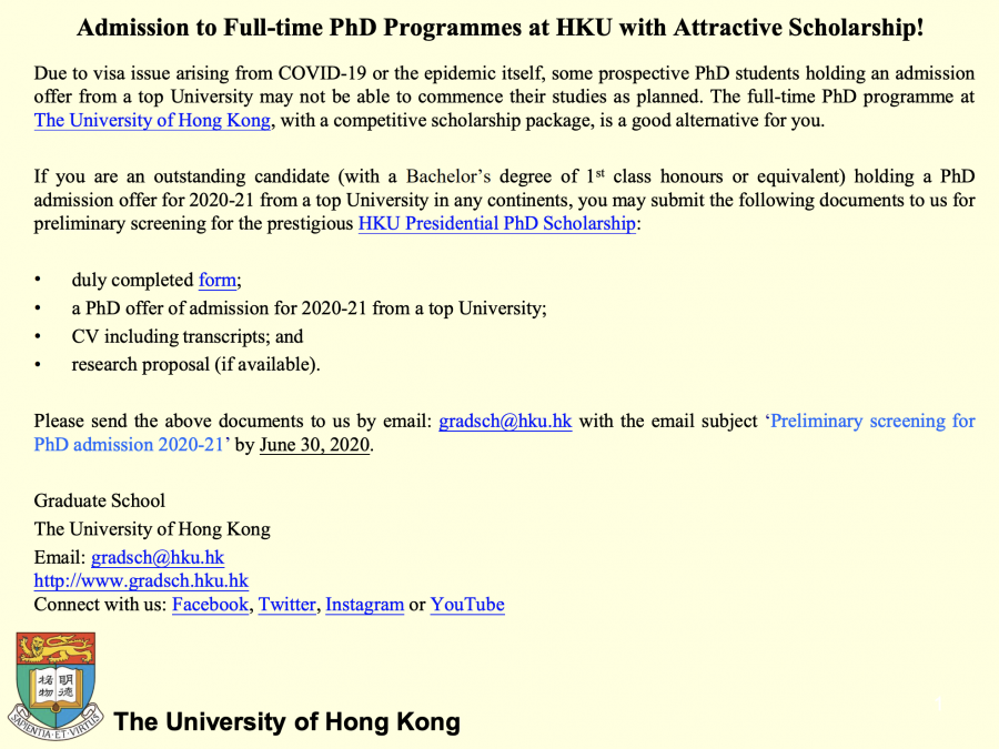 香港大学招收2020年博士全奖,欢迎拿到海外学校offer去不了的同学申请,截止6月30日