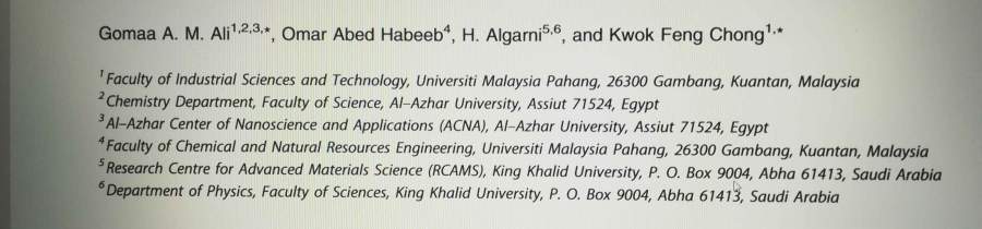 Faculty of Industrial Sciences and Technology, Universiti Malaysia Pahang, 26300 Gambang, Kuantan, Malaysia; Chemistry Department, Faculty of Science, Al–Azhar University, Assiut 71524, Egypt; Al–Azhar Center of Nanoscience and Applications (ACNA), Al–Azhar University, Assiut 71524, Egypt; Faculty of Chemical and Natural Resources Engineering, Universiti Malaysia Pahang, 26300 Gambang, Kuantan, Malaysia; Research Centre for Advanced Materials Science (RCAMS), King Khalid University, P. O. Box 9004, Abha 61413, Saudi Arabia; Department of Physics, Faculty of Sciences, King Khalid University, P. O. Box 9004, Abha 61413, Saudi Arabia. 发自小木虫Android客户端 |