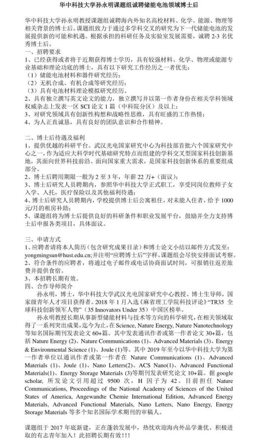 华中科技大学孙永明教授课题组诚聘二次电池方向博后,此招聘长期有效!!!