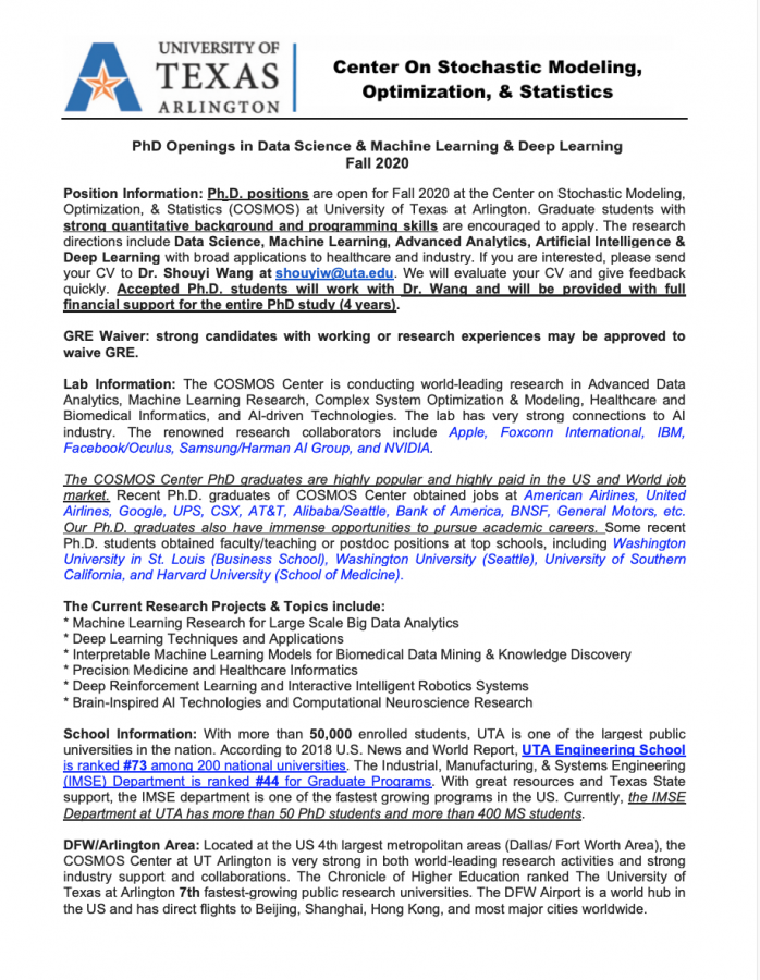 2020 fall 博士招生, 方向:机器学习/深度学习/数据挖掘/智能系统 center on stochastic modeling, optimization, & statistics (cosmos) the university of texas at arlington 感兴趣的同学可以发简历给 Dr. Shouyi Wang, shouyiw@uta.edu https://mentis.uta.edu/explore/profile/shouyi-wang 由于签证原因, 一些国际学生无法入学,cosmos需要补招2020 fall ph.d. positions。有工作经验和研究经验的可以申请gre waiver。cosmos center的研究方向主要集中于data science, machine learning, 以及ai技术在多个领域的跨学科应用。cosmos center 毕业生工作就业非常好,近期博士毕业生就业包括大学教职,哈佛大学研究员,硅谷金融大数据数据工程师,美国航空aa大数据分析,美国西南医学中心。uta在达拉斯附近,大公司密集,生活便利,实习和工作机会很多。 Screen Shot 2020-06-11 at 2.10.14 PM.png |
