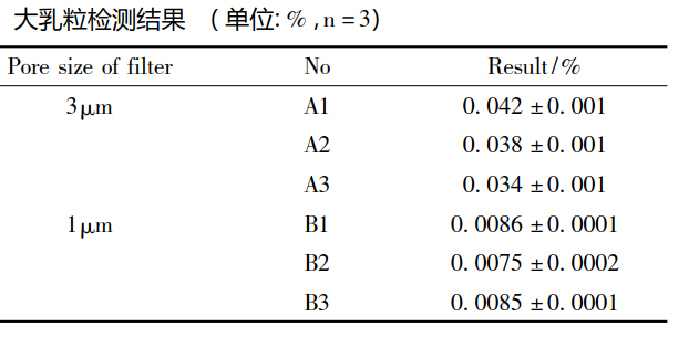 不同滤芯过滤脂肪乳对大乳粒的影响