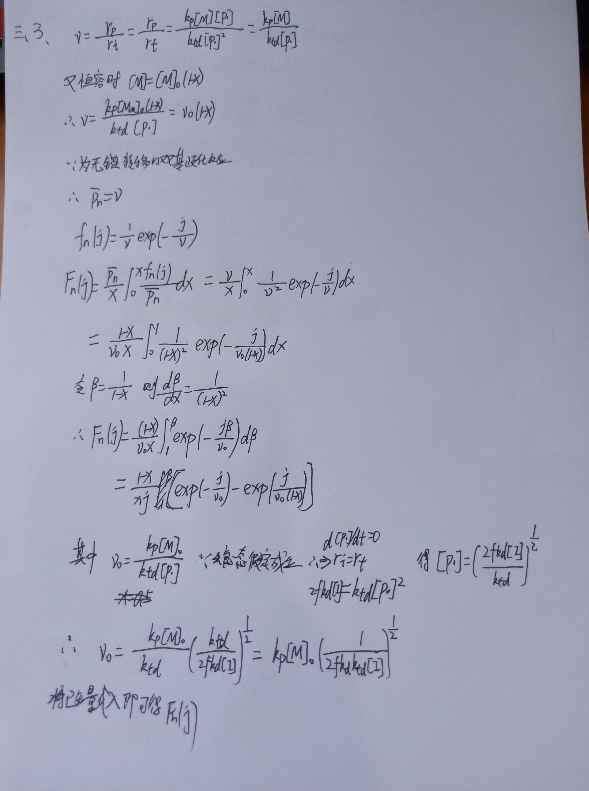 某连锁聚合反应的机理为双基歧化终止、无链转移。 已知:单体的初始浓度CM0=1.1mol/L, kp=3.5×10^4,ktd=1.8×10^2 。若活性中心的稳态假定成立,且反应在恒容下进行,试求:单体转化率为50%时等温间歇操作的累积数基聚合度分布函数。 目前是这么写的,但是算不出来,是题目少了信息吗?还是有其他办法 发自小木虫Android客户端 |