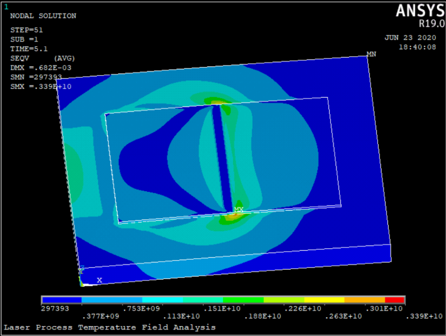 本人的课题方向是激光熔覆方向的,最近在做激光熔覆的温度场和应力场的仿真,温度场做出来的结果正常,然后用间接热结构耦合的方法,先转换模型的单元类型,再将温度场的计算结果作为载荷进行应力场的仿真,仿真时施加的位移约束是自由位移约束,但是应力场仿真的结果算出来的应力大小比正常值大了一个数量级,我看其他论文里人家算出来的正常值应该是10的9次方,也就是几百兆帕,但是我算出来的是10的10次方,就是几千兆帕了,这很明显太大了,而且实际情况中基板熔覆后两边应该是往上翘的,可是我的模拟结果却是往下翘的,请问各位大佬这是什么情况,怎么解决,下面附上我应力场部分的命令流。仿真结果见下图。