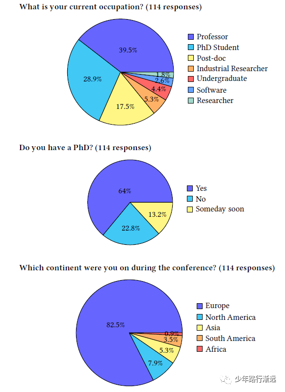 2020年年初,一场突如其来的疫情席卷全球,使得全球约有90%的国际航班停飞,由此也使得大约80%的的国内外学术会议延期举办或改为线上会议。根据历史数据估计,2020年大约有2千万场学术会议,由于疫情而重新计划(取消、延期或改为线上)。特别是对于会议比较多的计算机和医药学科而言,因为疫情延期、取消或者改为线上的会议是数不胜数,这些会议涉及的时间范围从2020年2月初甚至到2020年年底。 毋庸置疑,学术会议给同领域的来自全球不同地区的学者及硕博研究生提供了一个相互交流、相互认识的机会,同时也在一定程度上促进了学术交流和思维碰撞。然而,在当前全球疫情爆发的大背景下,除了少部分学术会议延期举行外,大部分的学术会议最终决定改为线上会议。那么,在线学术会议真的可以取代传统的线下会议吗? 一、参加学术会议的意义 学术会议作为同行业学者进行研究成果分享、技术交流以及相互认识、建立联系的桥梁,在促进科技发展与技术交流中发挥着重要作用。一般来讲,参加学术会议的意义可言总结如下:论文宣讲、学术交流。对于学术会议的参与者而言,特别是硕博研究生而言,参加学术会议的首要目的,是为了宣讲自己的研究成果,与同行就该论文进行探讨与交流,使得文章能够收录在公开发表的论文集中。 聆听报告、思维碰撞。除了宣讲论文自己的论文外,与会者可以参加并聆听领域大牛的Keynote包括、各种的Tutorial报告以及其他与会者的论文宣讲,通过报告的聆听,开拓学术视野,激发灵感。 相互认识、学术社交。在会议之外的茶歇(Coffee Break)和其他的Social Events,对于参会者来说,特别是对于硕博研究生而言,参加学术会议是一个与同行(特别是领域大牛)相互认识,建立联系的绝佳机会。 二、线上会议的利与弊 近些年来,随着在线远程会议技术的不断成熟,越来越多地人们呼吁减少线下的学术会议,组织在线的学术会议。特别地是,据新闻报道:有学者利用碳足迹测算了一位参加国际学术会议的碳排放量(仅仅是往返航班的碳排放量)为360kg,并估计全球每年因为参加学术会议的差旅,而产生的大量的碳排放,这将会在一定程度上加速全球变暖。所以,在线的学术会议的节能环保理念,已经被越来越多的学者所认可。特别地是,受到此次疫情的影响,更是加速了从线下学术会议到线上学术会议的转型。当前,对于大部分会议组织者来说,选择将线下会议改为线上会议,主要原因有多方面:1)文章出版的时效。如果会议延期举行,已录用文章的作者无法按期对论文进行宣讲,将会直接影响到会议论文的出版时间,这对于硕博研究生毕业以及需要论文评职称的与会者而言,将会产生较大的影响。2)疫情结束时间无法准确预估。当前疫情发展态势无法准确预估,延期举办的时间目前来说仍然无法确定,特别是即使疫情过后的段时间内,部分参会者仍会有顾虑。3)线上会议技术已经成熟。当前的在线会议进行已经成熟,各种在线会议平台(Zoom,Microsoft Team, Skype,腾讯会议等等)也是如雨后春笋,这给线上会议的召开提供了强有力的技术保障。 少年已经也曾在3月底参加了一次线上学术会议,所以在这里根据自己的参加线上会议的经历,尝试对在线学术会议的优缺点进行分析: 优点:1) 不受地点限制。尽管所有的会议报告和论文宣讲都可以通过在线会议进行,而且也通过虚拟的会议Channel组织并行的会议,不受参会者的地点的限制。2)有利于环境保护。在线会议减少了与会人员的出差的需求,将在很大程度上减少因为乘坐飞机和其他交通工具而产生的的碳排放,从而有利于环保。3)节约参会成本。对于囊中羞涩的课题组,特别是科研经费不足的实验室中的硕博研究生而言,可以帮助他们(特别是没有投稿的旁听参会者)在一定程度上节省参会的开支,有助于他们参加更多地会议。 缺点:1)线上的虚拟会议无法实现与会者的面对面交流。在线上的虚拟会议中,与会者无法真正地感受到参加学会会议的“氛围”,特别是对于刚踏入科研路上的硕博研究生而言,无法深刻地感受到参加学术会议的意义。2)与会者无法进行深入地沟通以及相互认识并建立联系。由于线上会议,主办方无法有效地组织社交活动以及茶歇期间的面对面交流环节,进而使得与会者无法更加深入地相互了解和认识,从而无益于以后建立长久联系。3)一天中能够进行会议的时间较短而导致每个人会议报告时间缩短。特别说对于国际学术会议来说,由于参会者处在全球的不同的时区,在一天中无法寻找较长并且适合所有人的时间段举行会议,所以只能在每天举办5-6个小时的会议。 三、线上会议能否取代线下会议 那么线上会议是否真正能够取代传统的线下会议呢,从参会者的视角来看,线上会议和线下会议的体验是否有很大的不同呢?近期,来自数据库领域EDBT/ICDT 2020 Joint Conference会议的主办方,对他们在3月底至4月初举办的线上会议的100多名与会者的参会体验进行了调查与分析,并总结了他们组织线上会议的经验,该报告[5]发布在arXiv预印本文献库中,以下是从他们报告中节选的部分调查统计的结果。 1.线上参会者的职位与所在地区? 从该项统计结果来看,参会者的群体主要还是教授和博士生为主,特别是对于博士生来说,参加会议是认识更多同行教授的最佳机会。与此同时,参会者的所在地区分布在5大洲,所以线