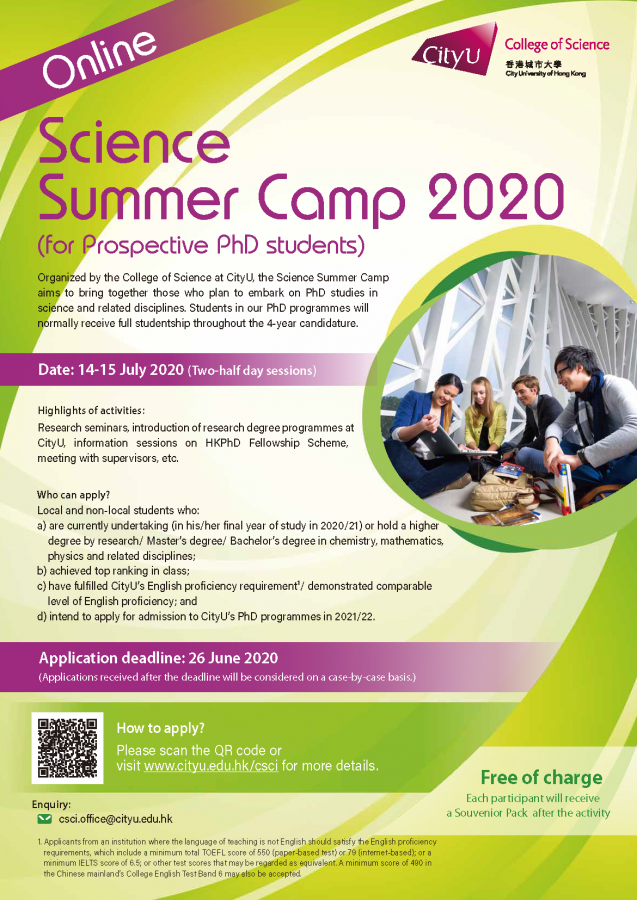 为了促进优秀大学生/研究生对香港城市大学化学系的了解,为优秀学子提供继续深造的机会,本系将在2020年7月14日-15日举办优秀大学生/研究生暑期夏令营活动。![]() 去年夏令营全奖phd录取率超过30%,特别优秀者更获系方推荐,成功拿到港府奖学金(全期港币超过130万) ![]() 本次夏令营采取线上活动形式,将安排学科导航、名师讲座、师生互动及提前面试等环节,热切欢迎学习成绩优秀,对化学、材料、能源、药物、催化、环境等相关方向有浓厚兴趣,且有志于攻读博士学位的化学相关专业2021届优秀本科及硕士毕业生参加。 ![]() 有意者請准备1)申请表(请注明一位意向导師),遙同2)简历、3)成绩单、4)托福/雅思/英语六级成绩单发送到 chem.enquiry@cityu.edu.hk. 邮件标题请用 [姓名]+cityu chem summer camp 2020 优先录取期6月26日截止,但之后我们仍会积极考虑申请者,如果有意参加者请尽快报名吧 :d 官方网页:https://go.cityu.hk/mtsy55 关于化学系 香港城市大学化学系是香港城市大学理学院的三个基础学系之一,现有教职员35人,其中杰出教授8人,正教授5人,副教授14人,和助理教授8人,其中包括2名欧洲科学院院士和1名匈牙利科学院外籍院士,以及3名科睿唯安高引科学家。化学系与海洋污染国家重点实验室、超金剛石及先进薄膜研究中心有緊密联系,并与中国科技大学、中国科学院理化技术研究所建立了联合研究的中心或实验室。 师资力量:https://www.cityu.edu.hk/chem/academic.html summercamp2020.png |