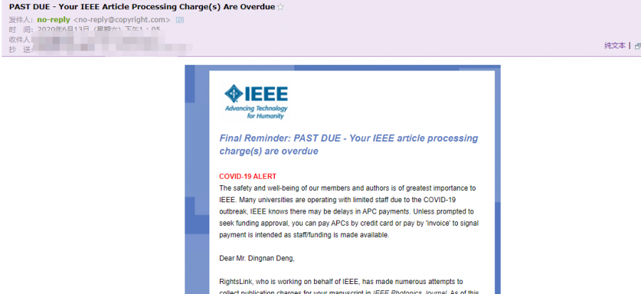 最近中了一篇IEEE Photonic journal文章,但一直没法版面费通知。最近收到一邮件需要在RightsLink支付,我记得以前不是在这里支付的,不知道这个系统是否合法,有没遇到类似情况虫友,麻烦告知下,谢谢 微信截图_20200626154650.png |