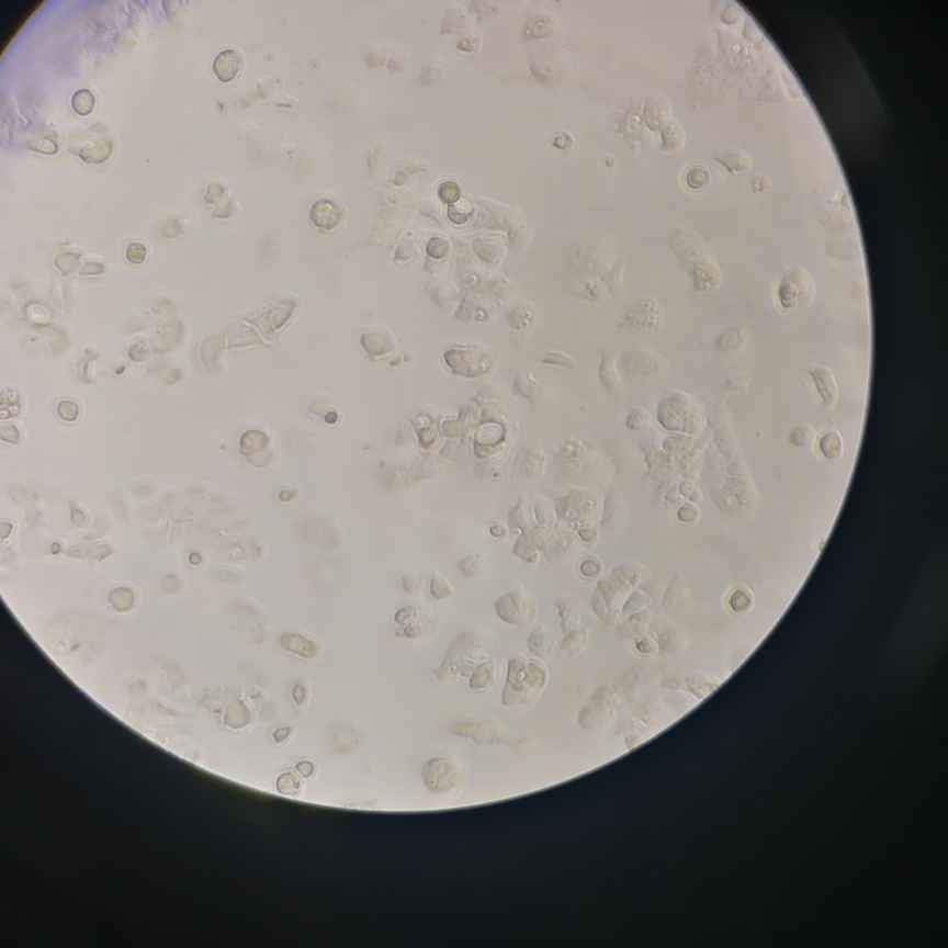 新手养的hepa 1-6小鼠肝癌细胞,前天在低倍观察到培养皿中有这些东西,我按照正常步骤还是消化了细胞,换了培养皿,之后再去看旧培养皿就还存在这个东西。今天我分的细胞就出先长得比较慢的情况,但是培养基颜色也没有变得发黄和浑浊,就跟普通的变成淡粉色差不多。铺板了96孔板。密度我种的8000个每孔,24小时了感觉密度不够。