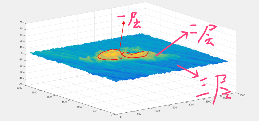 如图所示,图片是经过三维激光扫描所得到的三维形貌图,利用原始数据在matlab中绘制得到,才三维图主要分为三层,我想利用MATLAB计算出不同层的高度并求其所占面积,能实现吗?求大神帮忙 下载.png |