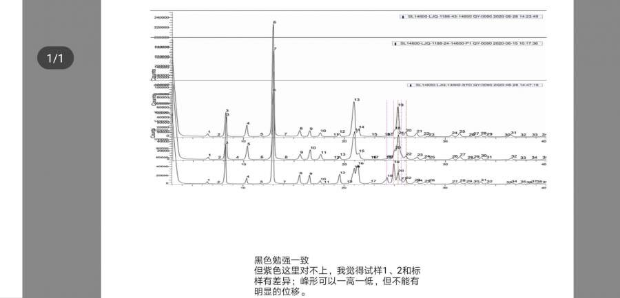 嗯嗯,我也在想可能我给的信息还跟不充分,生产留样的标样是结块的固体经过粉碎得到的,后续两个试样是直接析出的小晶体抽滤得到的,我猜想可能粉碎的过程对晶面产生了部分破坏作用,导致从图上看标样的有几个峰形差一些,但是总体的晶型应该还是一样的吧 发自小木虫Android客户端 |