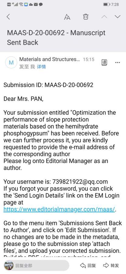 投稿之后编辑部一直回复 before we can further process it, you are kindly requested to provide the e-mail address of the corresponding author 改了通讯作者地址也不好使,不知道大神们有没有遇到过类似情况。 微信图片_20200707222857.jpg |