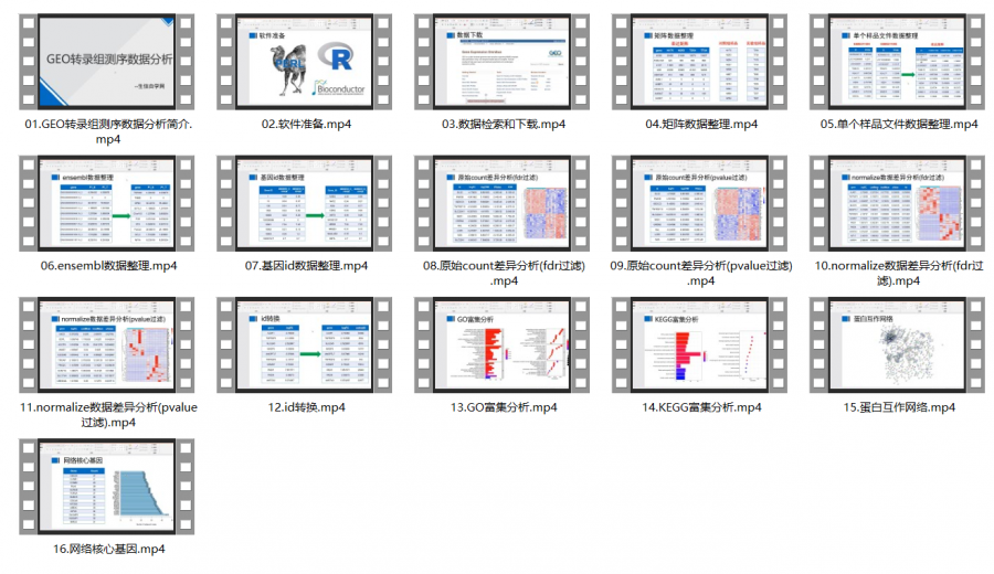 课程内容包括:geo转录组测序数据分析简介,软件准备,数据检索和下载,矩阵数据整理,单个样品文件数据整理,ensembl数据整理,基因id数据整理,原始count差异过滤(fdr过滤),原始count差异分析(pvalue过滤),normalize数据差异分析(fdr过滤),normalize数据差异分析(pvalue过滤),id转换,go富集分析,kegg富集分析,蛋白互作网络,网络核心基因。