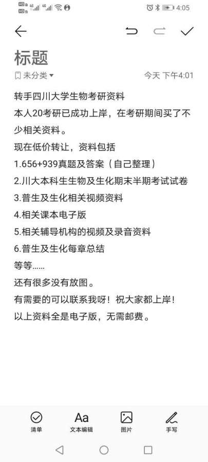 转手四川大学生物考研资料 本人20考研已成功上岸,在考研期间买了不少相关资料。 现在低价转让,资料包括 1.656+939真题及答案(自己整理) 2.川大本科生生物及生化期末半期考试试卷 3.普生及生化相关视频资料 4.相关课本电子版 5.相关辅导机构的视频及录音资料 6.普生及生化每章总结 等等…… 还有很多没有放图。 有需要的可以联系我呀!祝大家都上岸! 以上资料全是电子版,无需邮费。 发自小木虫Android客户端 |