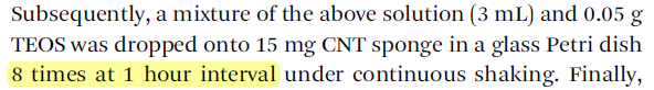 如图,标黄的8 times at 1 hour interval怎么理解? 是上述3ml溶液和0.05gTEOS的混合物在一小时内分八次加入?还是每隔一个小时加一次,一共加八次,每次都是加上述3ml溶液和0.05gTEOS的混合物? 搞不明白,请大神帮忙看看,做实验难啊,请帮忙看看,谢谢 微信截图_20200709215836.png |