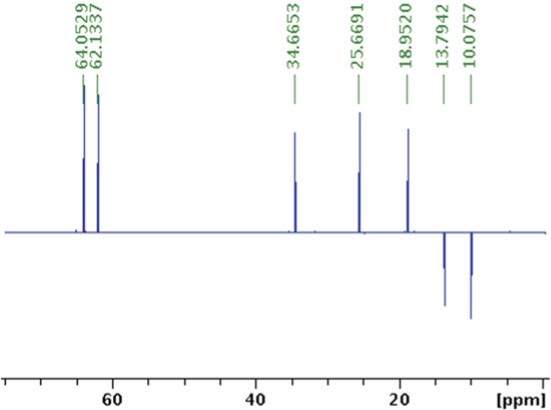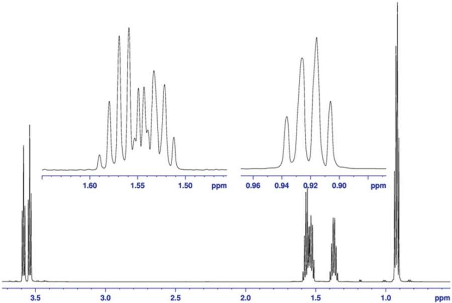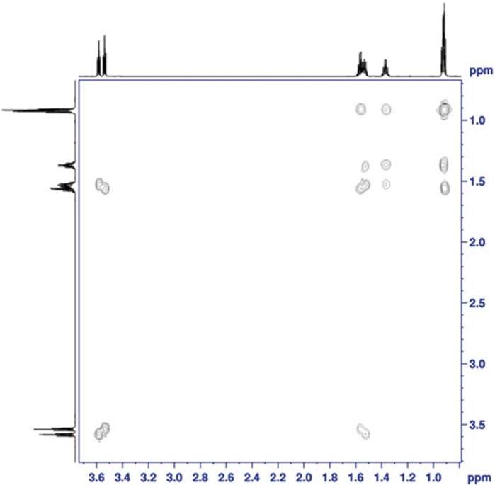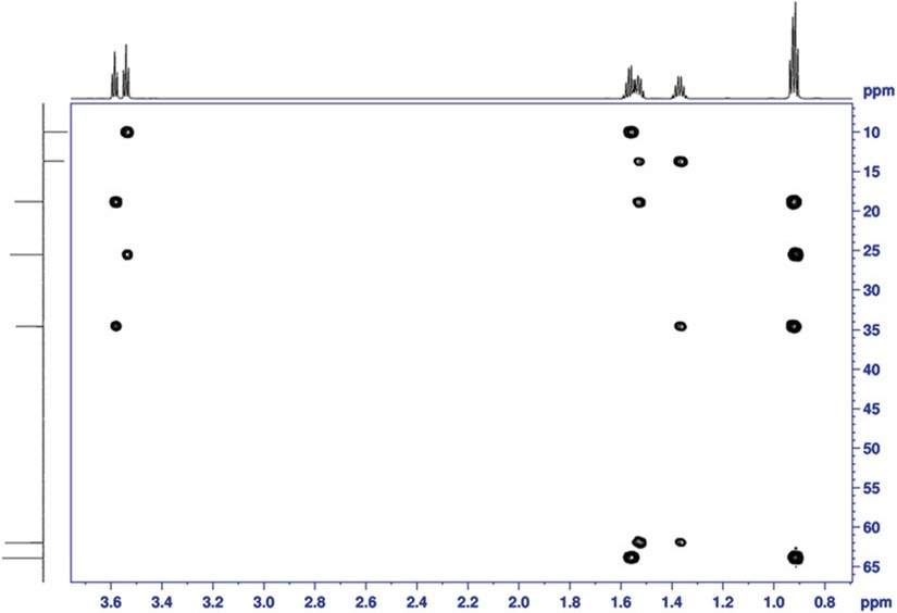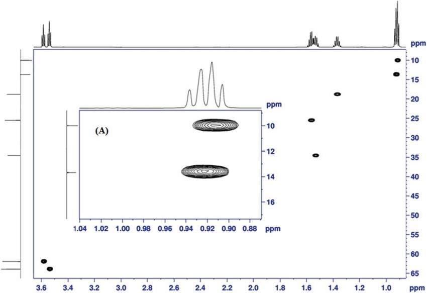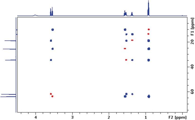 例如,在0.92ppm左右观察到的质子多重波信号与10.07和13.79ppm处的两个碳峰相耦合,证实质子核磁共振信号确实是两个重叠的信号。类似地,约1.55ppm的质子倍增与两个碳信号耦合,而1.37、3.54和3.58ppm的剩余质子信号中的每一个仅与一个碳信号耦合。