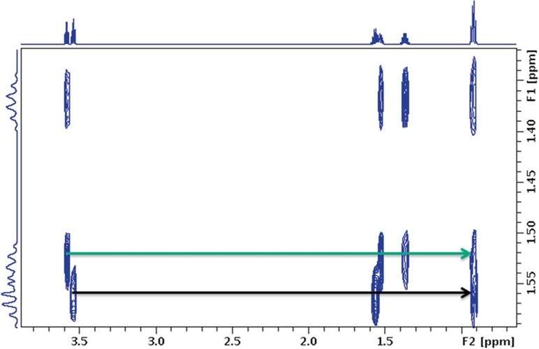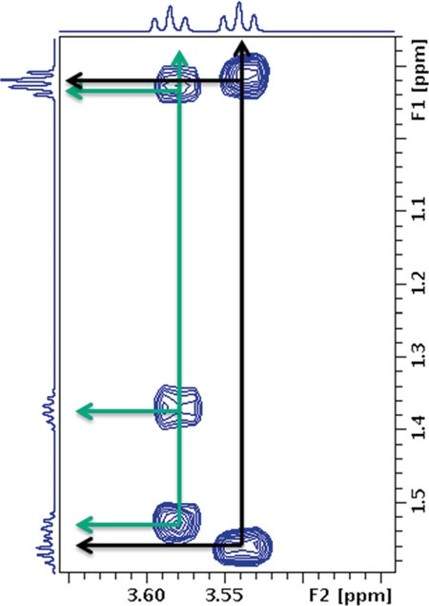 下图示出了上页图的扩展区域。很明显,正丙醇峰可以通过简单地检测共享四个互相关峰(正丁醇,绿色箭头)的信号与仅共享三个互相关峰(正丙醇,黑色箭头)的信号进行分辨。通过在绘图轴上绘制从交叉峰到1D光谱的投影来完成峰值的比对(下图)。将绿色箭头(丁醇)与3.584ppm处的信号相连的箭头投影证实了该峰值指的是丁醇,而不是丙醇;将1.564ppm处的信号与黑色箭头相关联的第二个投影证实了该峰值对应于丙醇分子(下图)。确认一个峰为丙醇,另一个峰为丁醇,就足以利用TOCSY谱完成两个分子的所有信号比对(下图)。1H NMR信号的分配可与其它2DNMR技术相结合,如异核相关谱。这将有助于分配其他核信号,如碳核磁共振谱。