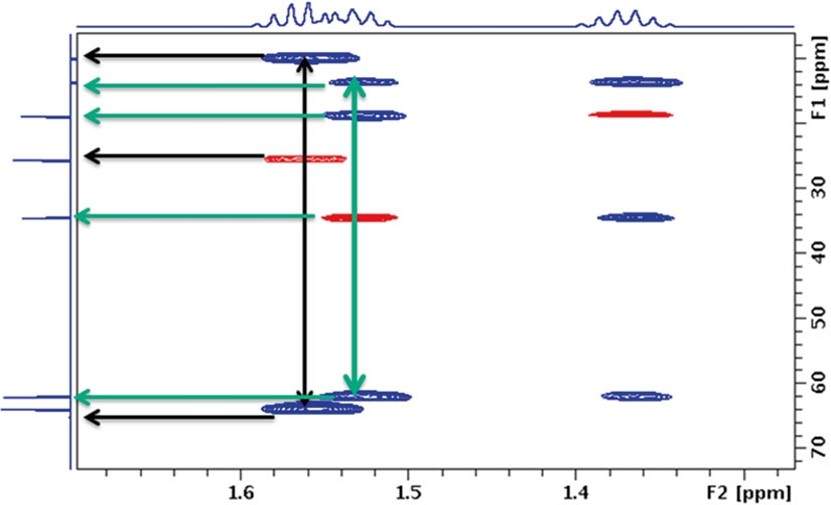 此外,HMBC和HSQC光谱可用于正丁醇和正丙醇的分离和分配。例如,连接25.67ppm的碳信号和1.564的质子共振的碳HSQC交叉峰(红色)与两个HMBC交叉峰(黑色箭头)对齐,因此,将三个峰分配给正丙醇分子,而HSQC(红色)与另外三个蓝色HMBC交叉峰对齐,将这些峰分配给正丁醇分子(绿色箭头;见下图)。