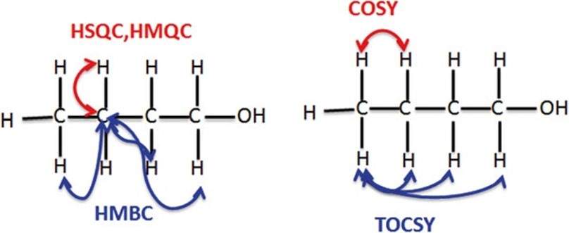 下图展示了正丁醇化学键连接的示例模型,该模型可以通过二维实验对同核关联和异核关联进行研究。