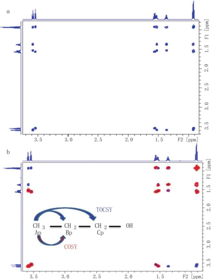 下图显示了TOCSY(蓝色)和COSY谱(红色)的叠加图:可以观察到更多的蓝色峰,它们代表与同一分子(正丙醇和正丁醇)相关的质子信号耦合的每个质子信号。这表明TOCSY谱可以用来分辨属于不同分子的重叠峰。