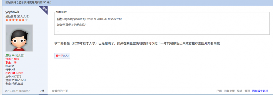 易老师您好,“编的剧本完全不对,其他内容就更不用说了。”这是您的答复。 第一,?? 您觉得我编剧本。请问如果我这样做,对我有什么好处?每天在小木虫发帖子招生的老师那么多,如果您看到我在其他老师那里留言,请截图,好说明我是到处编剧本阻止导师招生的奇葩。我不对学校或教师个人表达看法,我仅仅客观陈述个人经历,供各位想申博继续深造的学生参考。现在高校机制不透明,学生了解导师的途径非常少,如果当初有人站出来告诉我导师的相关信息,我也会少走很多弯路。高校博士正式入学年份和申请年份相差一年,楼里有人说是因为学生理解的和导师理解的不一样,这个说法我暂且接受,不过愿意去一个实验室当两年科研助理再读博的学生,也许不多。 第二,?? “其他内容就更不用说了”,这位教师,我之前评论的每一句内容都可以说的。如果您是指“学生通过在您实验室的科研助理工作申请到英国剑桥offer”(这一点在您其他帖子可以看到),我记得2019年6月底在清华大学西主楼1区303办公室,您亲口说这两个学生是清华本科生。当然,这位教师现在在帖子里也可以说他们不是清华的本科生!如果这两位学生是清华本科生,首先这样的本科背景申请欧美名校的难度并不大,其次如果没有在您实验室发文章,仅仅科研助理的经历,恐怕加持不大。如果学生不是清华的,您也可以具体说说学生的本硕背景,他们通过您实验室的科助工作申请到了欧美名校,工作成果是什么?是在您实验室的科助期间发了文章?那么是工作几年发了文章呢?清北的博士名额少,初审很严格,如果学生在科助期间没有发高影响因子的文章,但凭借实验室科助经历,也许并不是什么加分项。 很多学生是被博士名额吸引前去当科研助理的,但是如果当科助前文章不够申清华,一年科助期间没有高影响因子的文章,那么当科助后也还是不够申清华。 ? 个人经历客观陈述,一方面是对这位教师的回复,另一方面也是提醒各位想通过科助过度到博士的虫友,如果该校初审文章要求很高,那么科助的意义在于:在下一年博士申请初审截止日期前,发高影响因子的文章,用于初审考核;而不是在于所谓的提前熟悉课题,提前进组工作。祝小木虫的教师都能够找到合适的学生,也祝各位学生虫友能够找到心仪的博导,前程似锦! 发自小木虫Android客户端 |