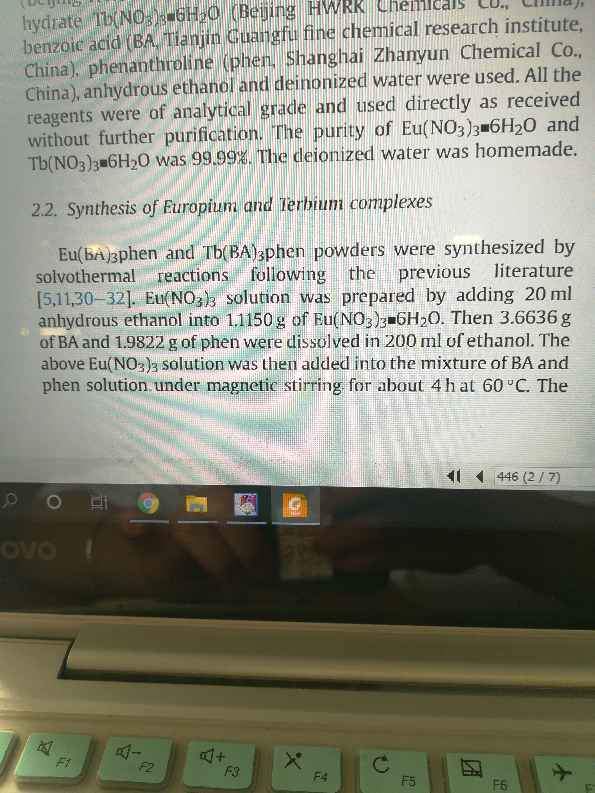 新人小白想做一个简单的铽配合物。 反应过程如图所示。我用的是六水合氯化铽。但是当我加入铽溶液后,并没有绿色荧光产生,而且最终也没有得到绿色荧光的产物,得到的是一堆微弱蓝色荧光的白色固体。 而我做铕的配合物时,一加入铕溶液,立刻发出红色荧光。 所以想问一下这是为什么呢?做了好几次了都是这样子的。 还有是我原料的原因吗?我的六水合氯化铽是白色粉末,但是没有荧光。但我的六水合氯化铕就是有微弱的红色荧光。 发自小木虫Android客户端 |