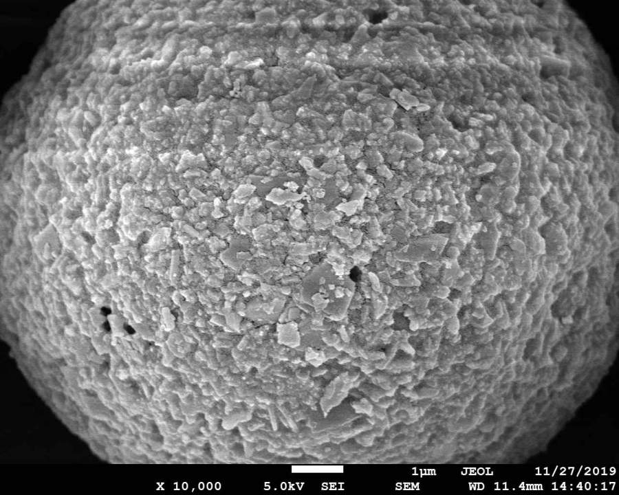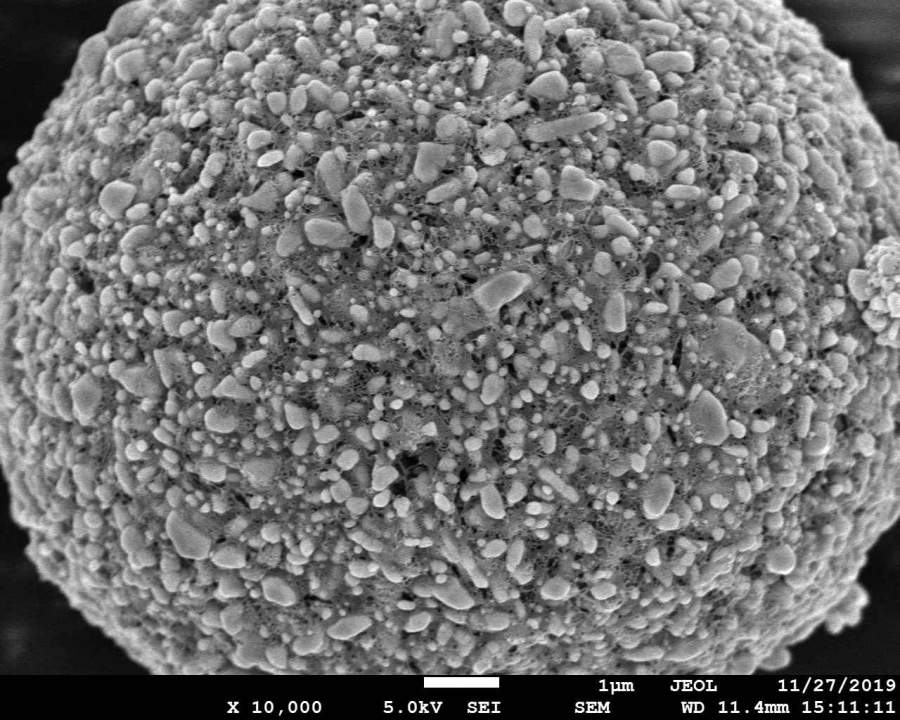 磷酸铁工艺路线,喷雾干燥烧结后(碳含量1.3%)测电镜。微球表面絮状碳较多,做了一些配方调整,未见明显效果。怀疑是喷雾和烧结上出了问题。请教有识之士,望赐教!