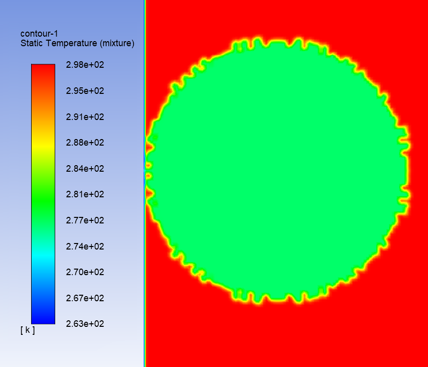 求大神指教,fluent计算二维液滴撞击的时候老师遇到液滴表面出现毛刺的情况(如图),条件是水滴以0.5m/s的速度撞击水平表面,环境温度初始化是25℃,液滴的温度在UDF中给定的也是25℃(但是算几个时间步之后液滴的温度就突然变成了10℃左右),表面变得十分不光滑。 液滴表面出现毛刺(相分数) 静温云图@wuming524 |