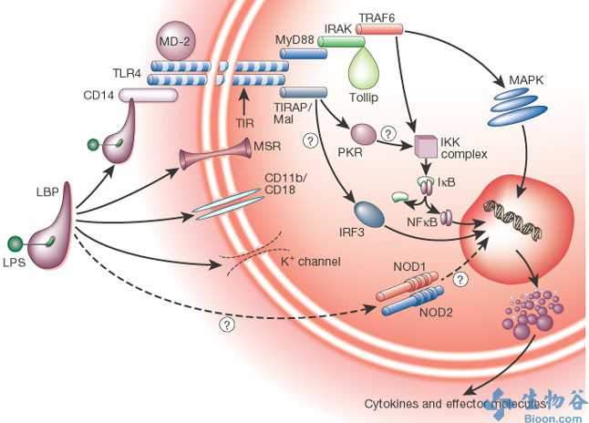 脂多糖是一种常见的内毒素(Endotoxin),在体内可以通过细胞信号转导系统激活单核巨噬细胞、内皮细胞、上皮细胞等,合成和释放多种细胞因子和炎性介质,进而引起机体一系列的反应。其主要作用机理已研究的较为透彻,如图2所示,当LPS进入机体入血后,脂多糖结合蛋白LBP可以识别LPS,与LPS单体结合运送至髓源性细胞表面。髓源性细胞表面的mCD14与之结合,形成LPS-LBP-CD14三联复合体,随后将其转运至TLR4-MD2蛋白复合体处,三联复合体在MD-2的帮助下与TLR4结合,激活TLR4,使之二聚体化。TLR4被激活后,胞内的集团构象发生变化,将信号传入胞内,从而活化胞内信号转导通路。信号传至胞内后,激活转接分子髓样分化因子(MyD88),IL-1R相关蛋白激酶(IRAK)通过MyD88和MyD88转接蛋白类似物聚集到受体复合物中,使IRAK磷酸化激活。随后IRAK从复合物中解离,把信号传给肿瘤坏死因子受体相关因子6(TRAF6),使 之活化。活化的TRAF6通过激活核因子-κB诱导激酶(NIK)和转化生长因子β活化的激酶(TAK1)进行信号转导,激活相应的NF-κB和丝裂原活化蛋白激酶(MAPK)两条通路。通过这两条通路,最终引起IL-1、IL-6、TNF-α、NO等的释放,形成炎症反应。