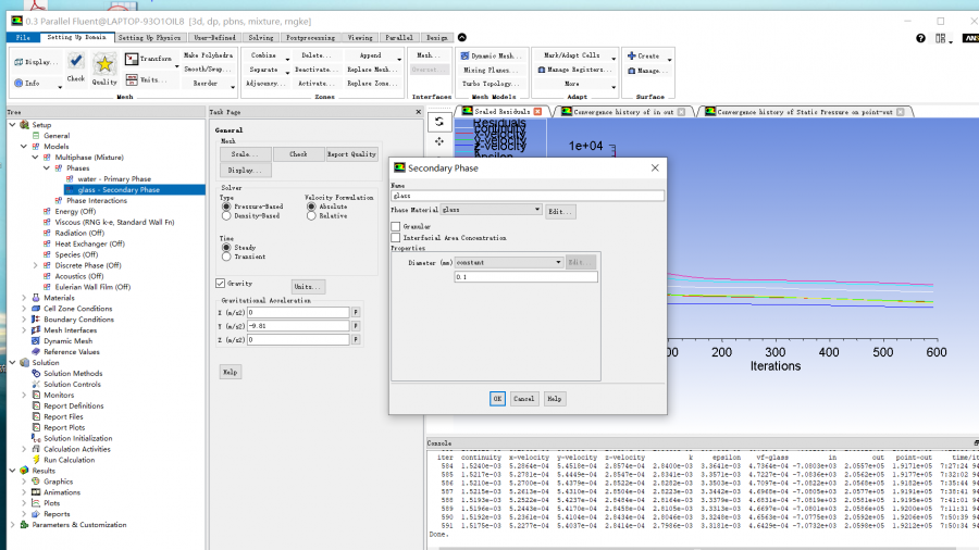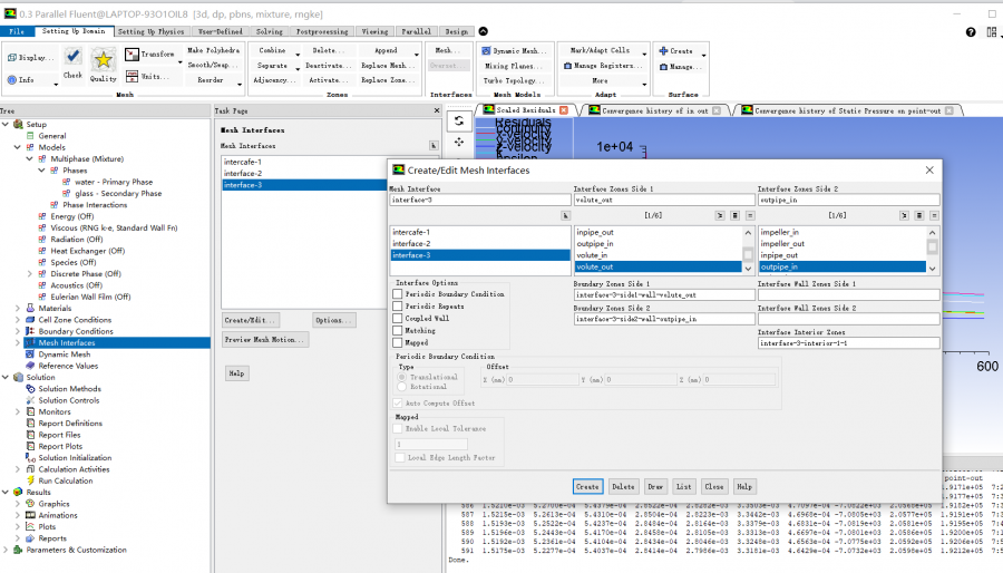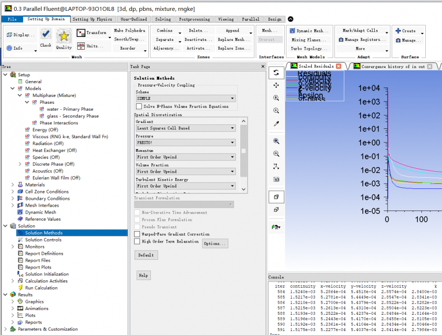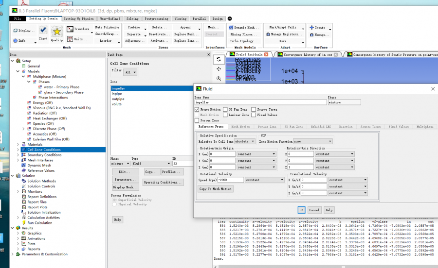 2、稳态、mixture (granular 下图是不勾选的结果,,,,勾选后,k、e波动厉害,但结果还是进出口压力增加,,,这个granular要不要勾选? )。k-e RNG湍流模型、MRF,叶轮流域旋转;