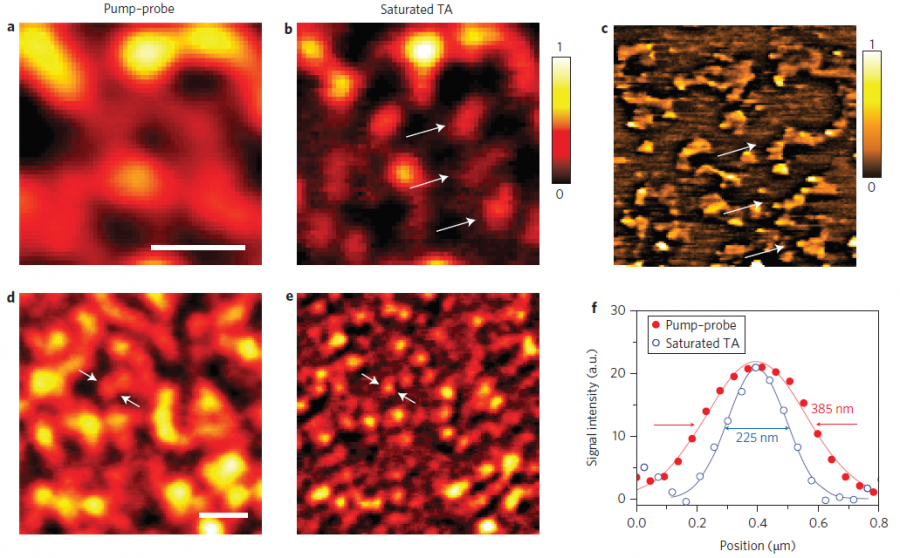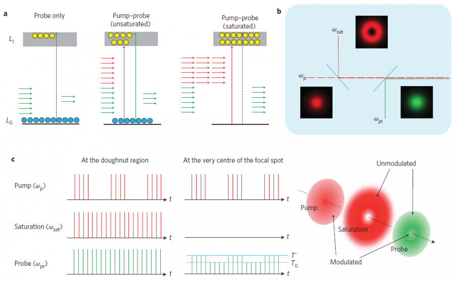 以下文章转载自微信公众号科学温故社 原创 enthalpy-entropy 2020-06-12 来自专辑:经典温故 原文阅读 编者按 显微镜生物成像技术在生物学、医学的发展中越来越重要,目前流行的成像方法主要是依赖于对样品的荧光的收集。虽然荧光显微镜有着高灵敏度的优势,但是其空间分辨率的进一步提高往往受限于光的衍射极限(与波长、物镜焦比有关)。有鉴于此,普渡大学(purdue university)的prof. ji-xin cheng于2013年在nature photonics期刊上发表了利用饱和瞬态吸收原理来突破显微镜成像的衍射极限的方法。在这篇文章中,作者巧妙地运用了激光环形输出模式自带的小空间尺寸,以及瞬态吸收(泵浦-探测,pump-probe)实验中记录信号间的差值的原理,实现了突破衍射极限的显微镜成像分辨率。笔者认为这种灵活运用(或改造)泵浦-探测技术的思维方式非常值得学习,也让我想起来本科期间大学物理实验室里流传的一句话:“会用仪器并不能算作真正的物理学家,会改造仪器才算” ,这也算是 “君子不器” 吧。接下来就让我们简要重温一遍这篇nature photonics。 正文 首先考虑两种泵浦-探测的方式。第一种方式,如图1a中的左边两幅图,在无泵浦的情况下,探测光有一部分被样品吸收,将样品从基态(l0)激发到激发态(l1),剩下一部分光子则透过样品;在有泵浦的情况下,泵浦光提前将一部分样品激发,从而使得样品的基态减少,激发态增加,那么当探测光达到样品时,样品对探测光的吸收减弱,更多的光子透过样品,这两次有无泵浦情况下透过的探测光光子数的差异,就是传统的泵浦-探测所得到的结果。 图1. 饱和瞬态吸收显微镜原理。a) 探测光与泵浦光与样品相互作用示意图;b) 饱和瞬态显微镜中三束光的光路示意图,三束光通过特定双色镜由左至右照射到样品表面;c) 透过样品各光束随时间的光强分布,在圆环面积内,探测光透过光强不随有无泵浦光而改变;在圆环空心区域内,探测光透过光强随有无泵浦光而改变,从而产生差值信号。 第二种方式,如图1a中的最右侧的图,无论有无泵浦,都在探测光到达样品前紧挨着加一束非常强的激发光(饱和光,saturation),强到可以使所有的样品都被激发,这样当探测光到达时,就没有任何基态样品可供激发了,因此探测光不会被吸收,而是完全透过样品。那么在这种情况下,无论有无泵浦光,透过的探测光光子数都一样,差异为0,泵浦-探测的信号也就为0。 在这以上两种方式的基础上,把这束饱和光的形状变成一个空心圆环(如图1b, 1c, 这种形状的光强分布可以通过选择激光共振腔的输出模式来实现,详见demtröder, wolfgang. laser spectroscopy 1: basic principles. springer, 2014.),那么如图1c所示,在圆环面积内(the doughnut region)就是以上所述的第二种方式,没有泵浦-探测信号,而在圆环的空心区域(the centre of the focal spot)就是第一种方式,有泵浦-探测信号,而且这个信号的空间分布的尺寸是受限于圆环内径的!当用这三束光(泵浦光,饱和光,探测光)一起逐点扫过整个样品平面时,就得到了样品的瞬态吸收信号成像图。当饱和光的圆环内径小于探测光的光斑尺寸时,该图的空间分辨率便由饱和光圆环内径决定,而不是探测光的光斑尺寸,从而实现了衍射极限的突破。 图2展示了这款饱和瞬态吸收显微镜对石墨烯纳米颗粒的成像结果。对比传统的瞬态吸收显微镜,饱和瞬态吸收技术将成像分辨率(点信号的半高全宽)从385纳米提高到225纳米,突破了仪器自身的衍射极限(300纳米)。如果使用波长更短的探测光(文中使用的探测光为830纳米),或提高饱和光的强度,那么分辨率还将进一步提升。 图2. 饱和瞬态显微镜对石墨烯纳米颗粒的成像结果以及低于衍射极限的空间分辨率。a)、b) 传统瞬态显微镜、饱和瞬态显微镜对第一批样品的成像结果,比例尺为1微米,color bar代表归一化的瞬态吸收信号强度;c) 原子力显微镜(afm)对第一批样品的表征结果;d)、e) 传统瞬态显微镜、饱和瞬态显微镜对第二批样品的成像结果,比例尺为1微米;f) 第二批样品中箭头所指颗粒在传统瞬态、饱和瞬态显微镜下的归一化信号强度分布,饱和瞬态显微镜所得样品信号的空间分布更窄,代表更高的空间分辨率。 点评 作者在文中提过,除提高分辨率外,该方法还可以拓宽生物成像试剂的范围,因为它利用的是样品的吸收性质,而非荧光,因此可以配合使用更具生物兼容性、但不一定有荧光性质的纳米颗粒来做生物成像;另外,如果使用沿波矢方向的圆环形饱和光,则可以实现样品厚度方向的成像;而且相比于扫描隧道显微镜(stm)或afm,瞬态显微镜不需要针尖与样品近距离接触,通过调整振镜(galvanometer mirrors)角度即可快速扫描整个样品。还有一点缺陷笔者想指出,因为在这种方法中必须使泵浦、饱和、探测这三束光共线才能实现突破衍射极限的分辨率,所以并不能得到传统瞬态吸收显微镜所擅长的激发态的空间分布动力学信息,比如载流子扩散动力学等,或许这就是 “鱼和熊掌不可兼得”吧。最后,希望这期文献回顾能对大家有所帮助! 关键词:衍射极限,饱和瞬态吸收 参考文献:wang, p. et al. far-field imaging of non-fluorescent species with subdiffraction resolution. nature photonics 7, 449╟453 (2013). |