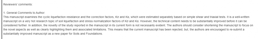 We have carefully studied comments from our reviewers concerning your paper. Although we fully appreciate the time and effort you have put into this paper, we are unable to reach a conclusion to accept the paper in its present form for publication in Soils and Foundations. Your paper would be reviewed again as a newly submitted paper if you rewrite the paper by cosidering the following reviewer's comments to the extent satisfactory to our committee. When and if you submit a revised version of the paper, please quote the present paper number. We sincerely hope, however, that the decision will not terminate your interest in our journal, and that we will have opportunities to be of service in the future. Yours sincerely Prof. Junichi Koseki Editor in Chief Soils and Foundations Reviewers' comments: 1. General Comments to Author: This manuscript examines the cyclic liquefaction resistance and the correction factors, Kσ and Kα, which were estimated separately based on simple shear and triaxial tests. It is a well-written manuscript on a very hot research topic of soil liquefaction and stress normalization factors of Kσ and Kα. However, the technical content needs to be substantially improved before it can be considered further. In addition, the novelty of the study reported in the manuscript in its current form is not necessarily evident. The authors should consider shortening the manuscript to focus on the novel aspects as well as clearly highlighting them and associated limitations. This means that the current manuscript has been rejected, but, the authors are encouraged to re-submit a substantially improved manuscript as a new paper for Soils and Foundations. |