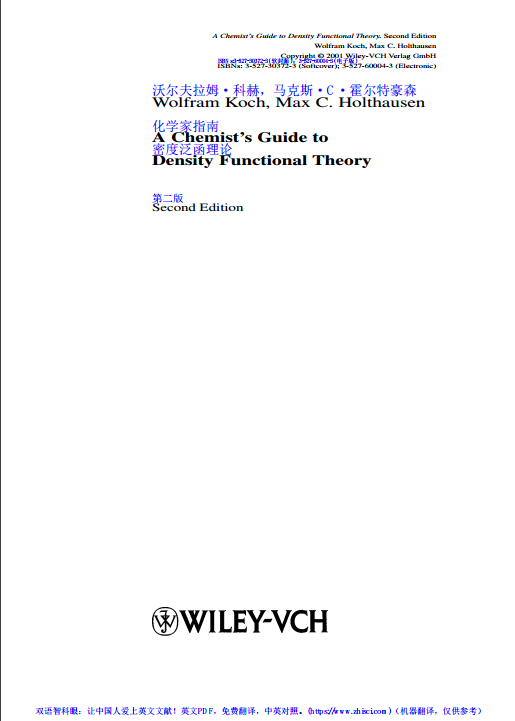 A Chemist's Guide to Density Functional Theory - Second Edition 密度泛函理论的化学家指南(第二版) 下载地址:https://www.zhisci.com/pdfshow/17612 Author:Wolfram Koch, Max C. Holthausen Chemists familiar with conventional quantum mechanics will applaud and benefit greatly from this particularly instructive, thorough and clearly written exposition of density functional theory: its basis, concepts, terms, implementation, and performance in diverse applications. Users of DFT for structure, energy, and molecular property computations, as well as reaction mechanism studies, are guided to the optimum choices of the most effective methods. 熟悉传统量子力学的化学家们将从这篇特别有启发性的、透彻的、清晰的阐述密度泛函理论:它的基础、概念、术语、实现以及在各种应用中的表现,都会大受欢迎和受益。结构、能量和分子性质计算以及反应机理研究的DFT用户可以选择最有效的方法。 |