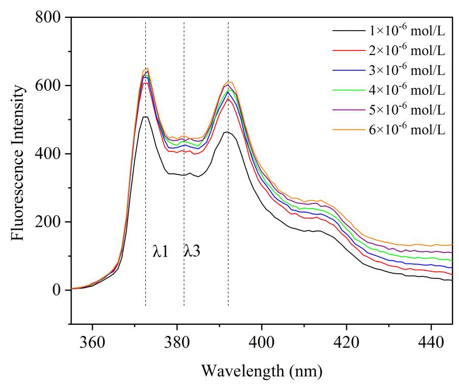 芘溶液的荧光发射光谱有5个特征峰,分别在373,379,384,394,480 nm附近。芘的第一发射峰与第三发射峰强度比值I1/I3 (在373 nm处荧光强度与在384 nm处的比值) ,最近用芘荧光探针法测临界胶束浓度,芘浓度为10-6mol/l,芘却在373nm和391nm处出现了强的荧光峰,请教这是什么原因?激发波长334nm,发射范围350-500nm Graph1.jpg |