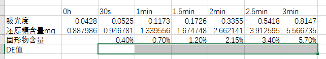 求问大家,DE值的具体计算公式到底是什么?我知道DE=还原糖含量/固形物含量,但是具体怎么计算呢?我是用α-淀粉酶水解淀粉,但是只想水解到DE值=2就停止反应。还原糖我是用DNS法测定,固形物含量用阿贝折光仪测定,显示的是Brix值。下图就是我测得一些数据,希望大家帮帮我,这个问题困扰我一个星期了![]() ![]() ![]() 1.png |