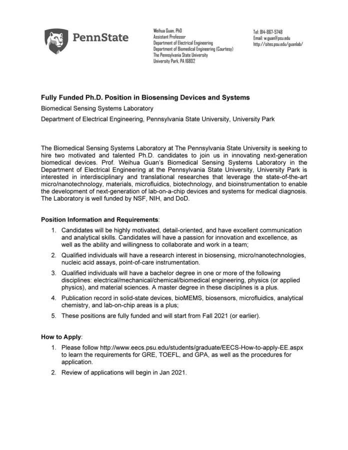 宾夕法尼亚州立大学Weihua Guan教授招聘博士研究生 (2021秋季)