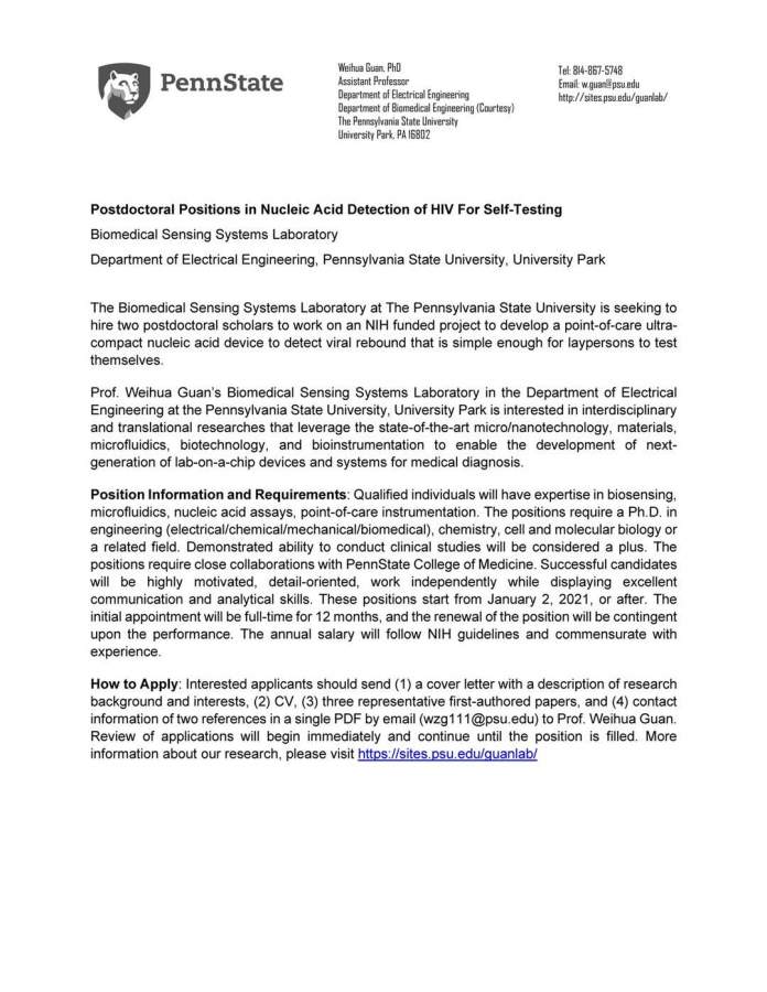 宾夕法尼亚州立大学Weihua Guan教授招聘博士后