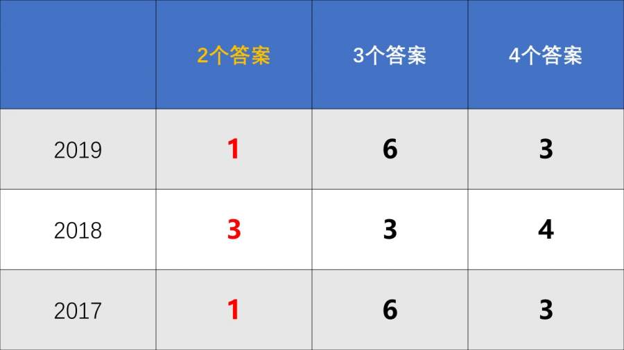 那么有人会问,如果多选很多题答案就是2个呢,你让我们尽量选3个,还是有可能得0分呀,这就需要我们大数据分析了,我把最近3年一建建筑的多选题答案个数做了一张表格,2个答案的题目三年分别为1个、3个、1个(每年多选总题数是10个),极少情况是2个答案,现在可以打消你的疑虑了吧。