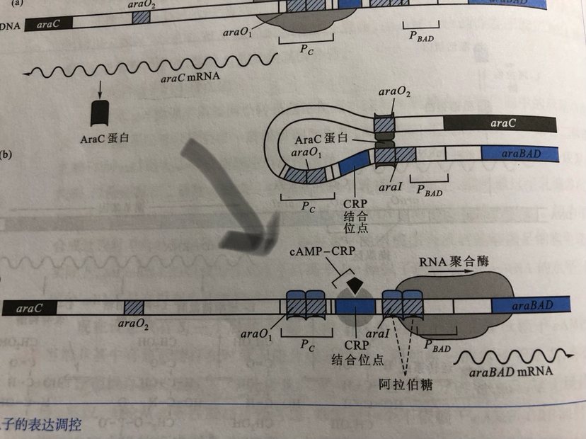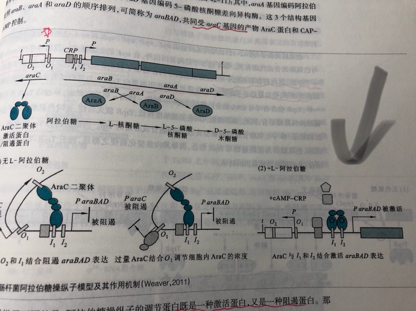 一副来自现代分子生物学(第五版 朱)另一副(weaver 2011) 在讲AraC结合了阿拉伯糖后,一幅图表示与o1和i结合,另一个表示与i1、i2结合 有人知道哪个是对的么? (搜索能力太渣没找到原始文献………) 发自小木虫IOS客户端 |
