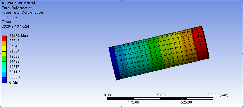 求助各位大佬,模拟出材料的总变形量,左侧底面固定,右侧端面受力,左侧比例尺怎么看,怎么看材料的变形量?图片怎么分析,附加载荷14MPa. @wuming524 变形图.png |
