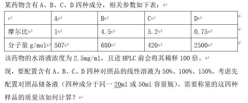 如图,我需要先配置对照品储备液,然后将其稀释成线性溶液。条件如下,对照品储备液中各组分的质量该如何计算?最好能有比较详细的计算过程。请大佬们多多指教